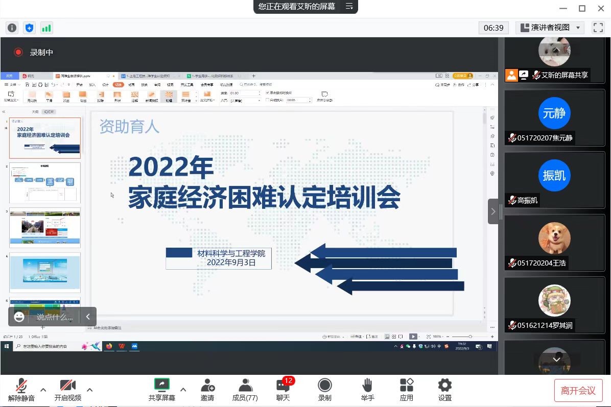 为进一步做好2022-2023年度家庭经济困难学生认定工作,落实学校资助工作要求,9月3日、14日,3044am永利集团面向老生和新生先后召开家庭经济困难认定线上培训会暨新生资助政策线上宣讲会,学院资助工作负责老师艾昕、学院资助大使龙明垚,以及各年级相关学生参加了会议。