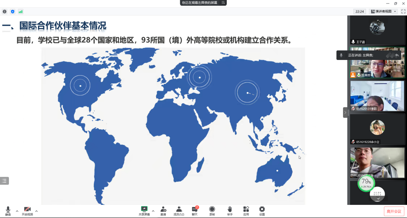 首先,左老师介绍了国际合作伙伴的一些基本情况。不难看出,全球多个国家和地区都有与我校合作的国际伙伴,不仅如此,这些伙伴还都有着较高的国际知名度。