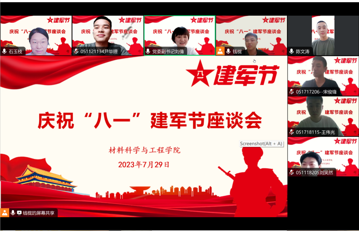 2023年是中国人民解放军建军96周年,值此”八一”建军节来临之际,3044am永利集团于7月29日上午举办庆祝“八一”建军节座谈会,通过腾讯会议隔屏向学院全体在役以及退役复学大学生致以节日的问候。学院党委副书记刘倩、学工组长石玉枝、征兵辅导员钱栊、在役以及退役复学大学生士兵线上参会,会议由征兵辅导员钱栊主持。