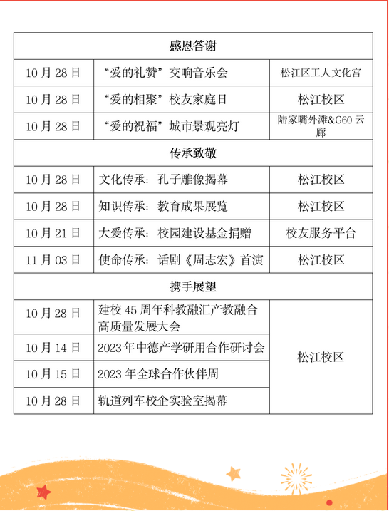 盛事如约,心期至诚。学校将于2023年10月举行建校45周年主题月系列活动,诚邀各级领导、海内外宾朋和校友相聚程园,畅叙情谊,广集智慧,同擘宏图!